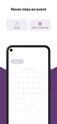NEVER MISS AN EVENT The event section shows a list of events throughout the district. Users can add an event to their calendar and share the event with friends and family with one tap.