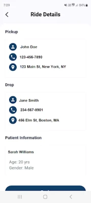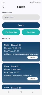 - View Ride Details - After click on search icon which is upper right corner placed user Goes in Search page in that Select any previous date or current date or next Day Date and tap on search button after that showing multiple rides - in multiple rides Details Button avalaible .After Click on Details button user can see Like name , Pick Up , Drop Details, Age , gender, Contact Details